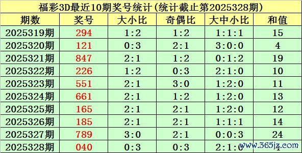 开奖追忆:福彩3D第2025328期奖号为:040。奖号类型为组三,和值为4,奇偶比为0:3,跨度为4,012路比为2:1:0,大小比为0:3。