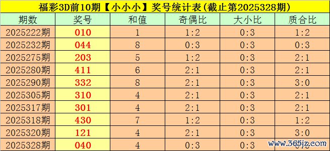一、上期转头:福彩3D第2025328期奖号为:040,奖号类型开出组三,大小比为0:3,奇偶比为0:3,和值为4,跨度为4,012路比为2:1:0。