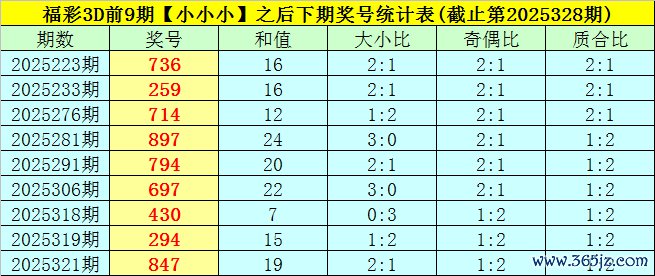 2、奖号质合比远离开出:1:2、0:3、2:1、2:1、3:0、2:1、2:1、1:2、3:0,总质合比开出16:11,其中有1期奖号质合比和上期奖号质合比相等;